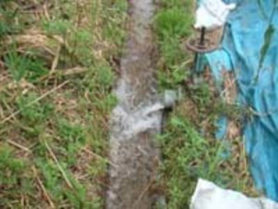 写真左側は砂層を30m敷き、そこにドレーンを入れたサンドフィルターによる脱水方法。写真右側がドレーンを入れた脱水方法。